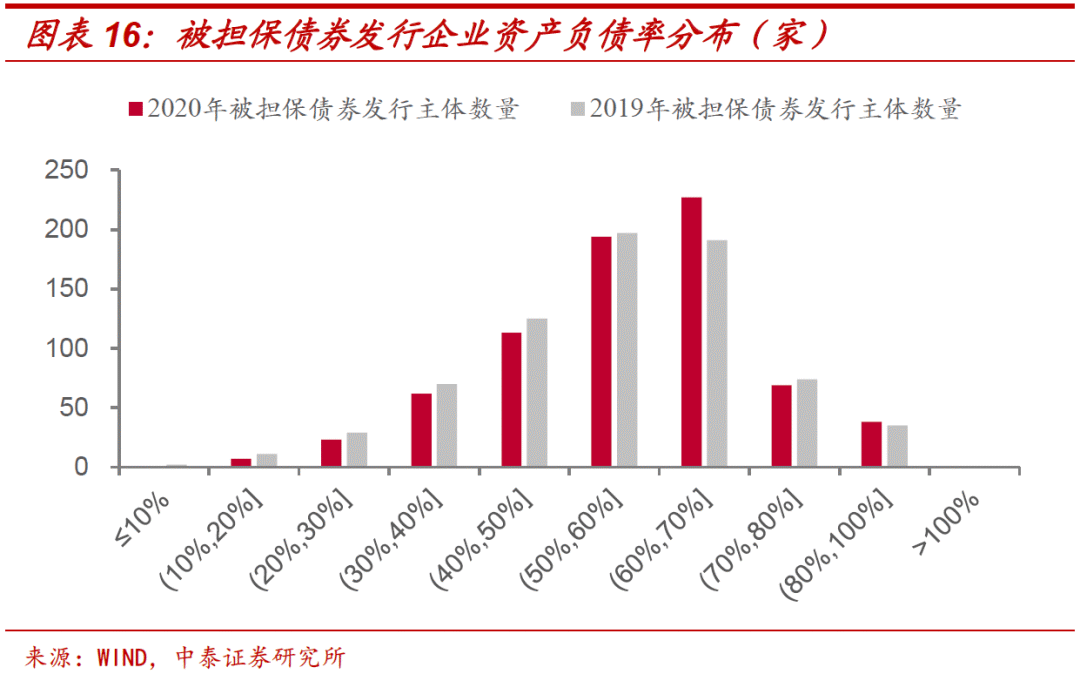被担保债券发行主体的资产负债率主要集中在50%-70%之间。2020年有529家被担保债券发行主体的资产负债率大于50%,占总发行主体的72%,较2019年占比增加了4.36%;资产负债率大于70%的企业有108家,占比15%,较2019年占比小幅减少0.14%。