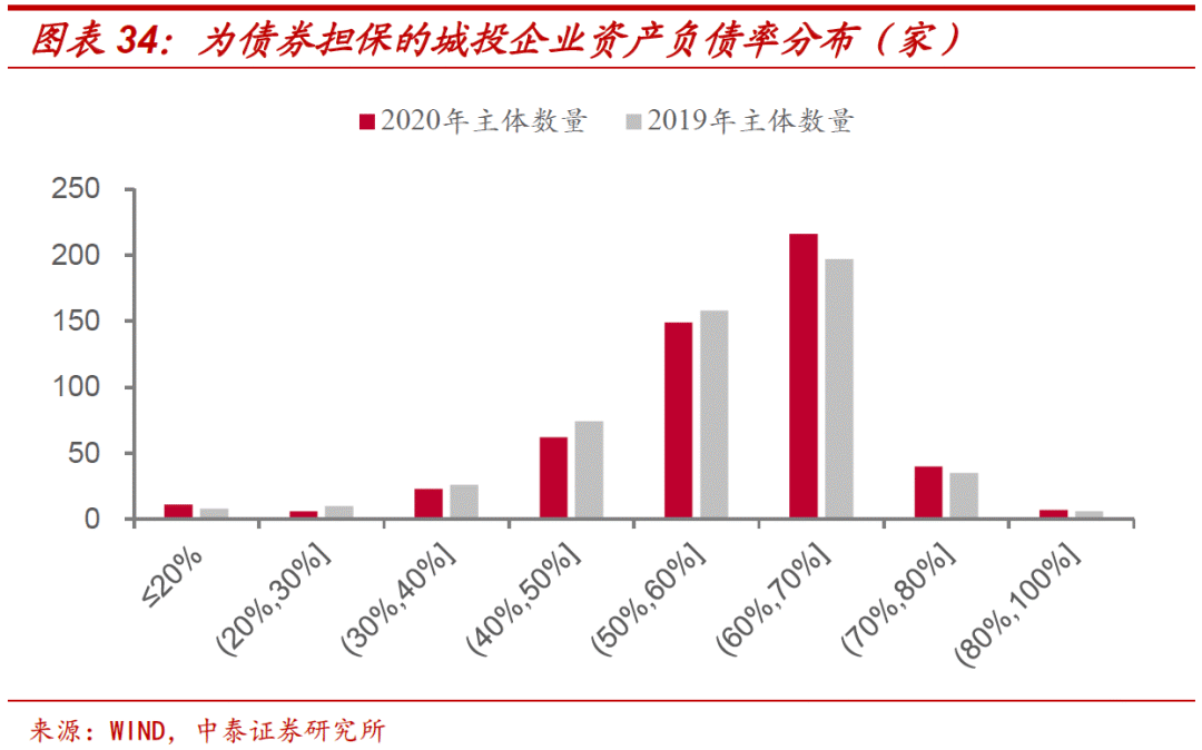 债务期限结构有所拉长,流动性压力有所缓释。从负债结构来看,2020年非流动负债/总负债的平均值较2019年有所提升,非流动负债占比在60%-80%区间的主体数量明显上升。2020年非流动负债占比在60%以上的主体有259家,占城投企业个数的51%。从债务期限结构看,为债券担保的城投企业债务期限结构总体拉长,2020年长期债务/带息债务占比在60%以上的城投主体有431家,占城投企业个数的85%,较2019年增加了1.88%。