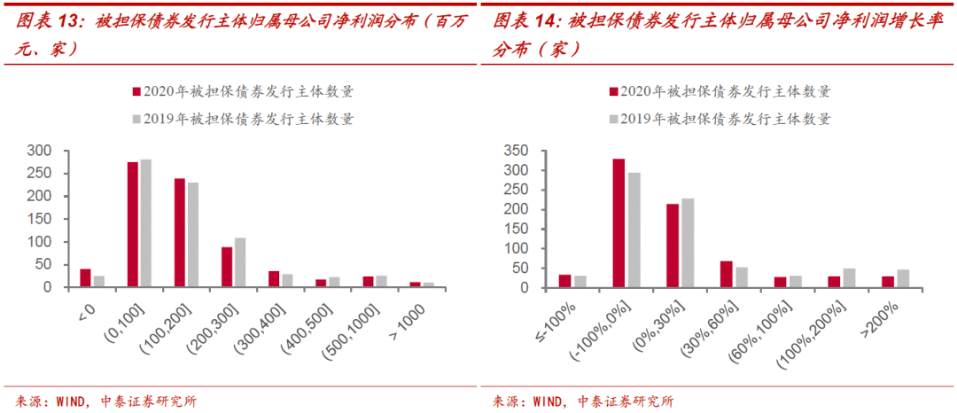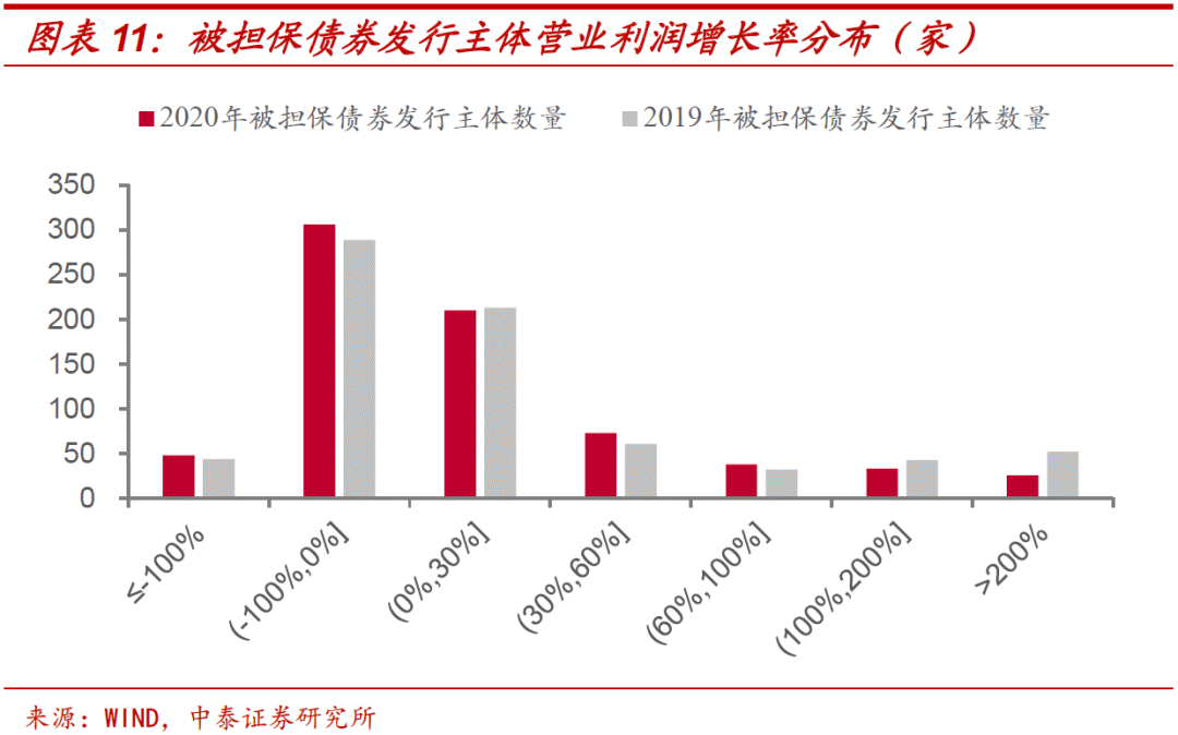 被担保债券发行人归属母公司净利润及其增长率的分布情况整体变化不大,2020年有363家企业出现归母净利润负增长,个别公司波动较大。