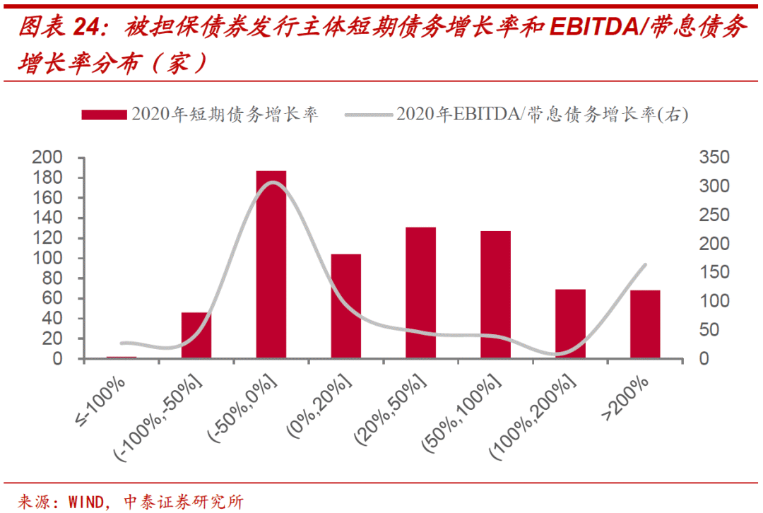 另外,我们将EBITDA/有息负债的增长率与短期债务增长率进行比较来分析发债企业对刚性债务的偿还能力。被担保债券发行主体短期债务增长率大于20%的有395家,占发行主体个数的54%,而EBITDA/有息债务的增长率大于50%的仅有263家,占比36%,利润的增长整体落后于刚性债务的增长。