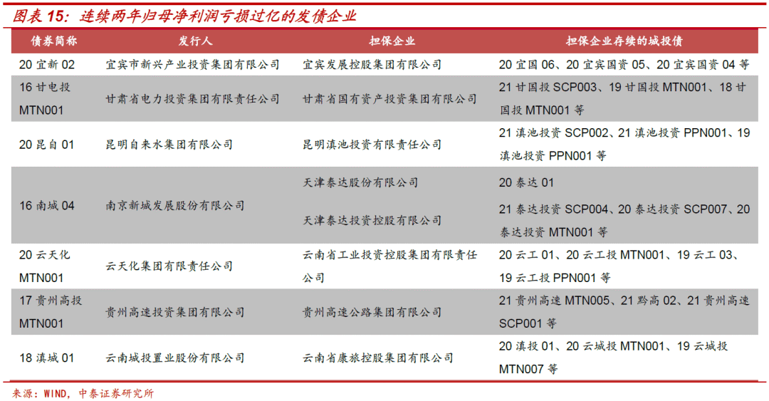 734家被担债券发债主体中,其中41家发行人2020年归属母公司净利润为负,较2019年增加了16家,其中22家发行主体2020年归属母公司净利润亏损过亿,宜宾市新兴产业投资集团有限公司、甘肃省电力投资集团有限责任公司、昆明自来水集团有限公司、南京新城发展股份有限公司、云天化集团有限责任公司、贵州高速投资集团有限公司和云南城投置业股份有限公司7家发行主体连续2年归属母公司净利润亏损过亿。