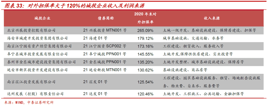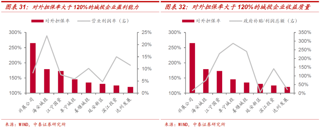对外担保率过高的城投企业或有负债风险较大,且大部分企业主营业务盈利能力不佳,依赖政府支持。对外担保率大于120%的城投企业共有9家,分别为北京兴展投资控股有限公司(简称“兴展公司”)、海安市城建开发投资集团有限公司(简称“海安城投”)、南京江宁国有资产经营集团有限公司(简称“江宁国资”)、阜宁县城市投资发展有限责任公司(简称“阜宁城投”)、泰州市金东城市建设投资集团有限公司(简称“姜堰城投”)、延安市新区投资开发建设有限公司(简称“延安新区”)、南京滨江投资发展有限公司(简称“滨江投资”)和达州发展(控股)有限责任公司(简称“达州发展”),整体盈利能力不强。从收益质量来看,滨江投资、江宁国资、姜堰城投、阜宁城投政府补贴占利润总额的比重在100%以上。