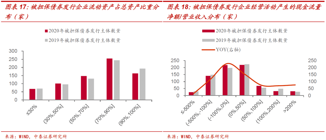 2020年被担保债券发行主体的资产负债率整体上有所抬升,流动资产占比基本持平,主营业务获取现金能力较差。
