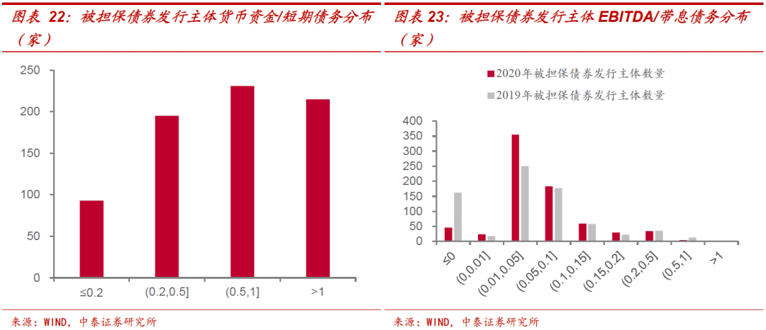 偿债能力上,从短期偿债指标看,超70%的被担保债券发行主体现金短债比小于1x,存在一定流动性缺口。其中,现金短债比小于0.5x的有195家,小于0.2x的有93家。从长期偿债指标看,EBITDA对有息债务的保障倍数不足。2020年被担保债券发行主体的EBITDA与有息债务的比值主要集中在0.01x-0.1x之间,具体来看,EBITDA对带息债务的覆盖比率小于0.05x的有424家,占发行个体总数的58%,与2019年基本持平。被担保债券发行主体整体偿债能力较弱,近两年变化不大。