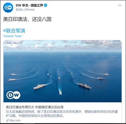 今年四月,《德国之声》刊登文章报道多国海军在印太地区进行联合军演,目的是“制衡中国在该地区的野心”。其中文推特的编辑转发这则报道的导语为“美日印澳法,还没八国”,暗示近代八国联军侵华的历史,揭中华民族的伤疤。可以说,在反华这点上,这家媒体毫不掩饰自己的帝国主义和殖民主义立场。