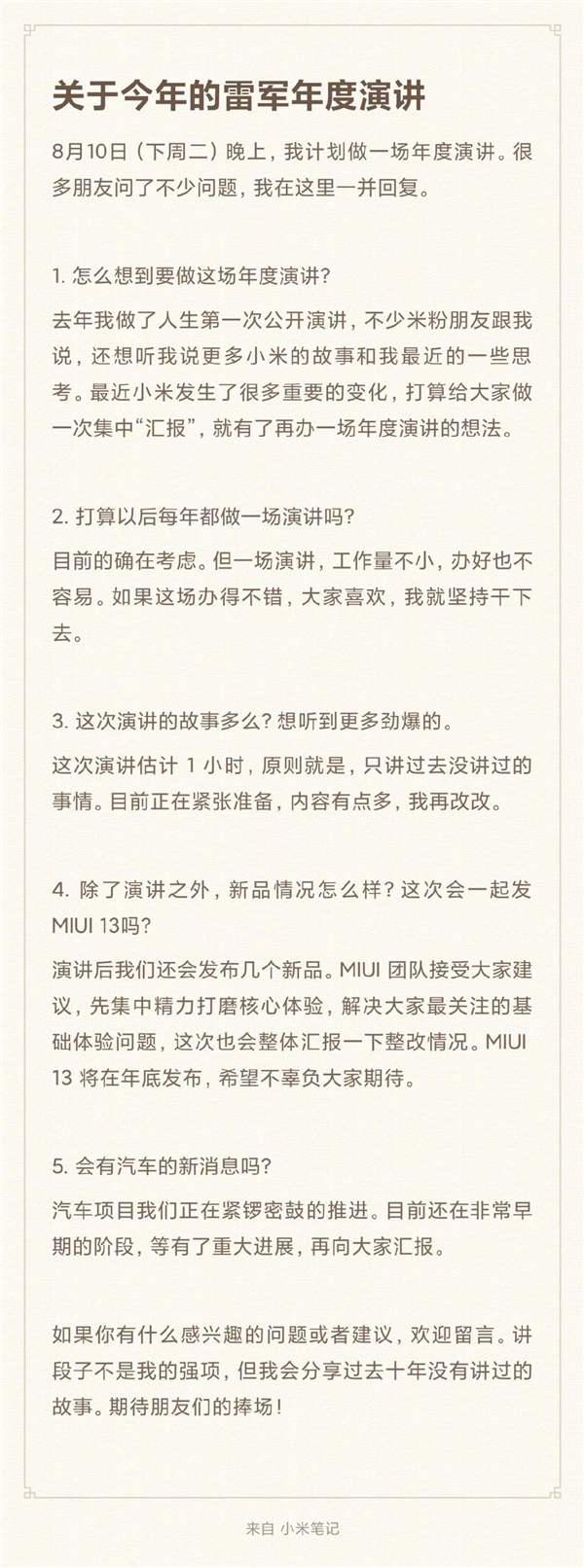 值得一提的是,雷军还回复了为何要做这场年度演讲。