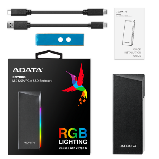 威刚 EC700G M.2 移动硬盘盒,自带两条数据线,还有一片导热贴,便于散热。产品兼容 Windows、macOS 多平台,官方暂时未公布产品售价和开售信息。