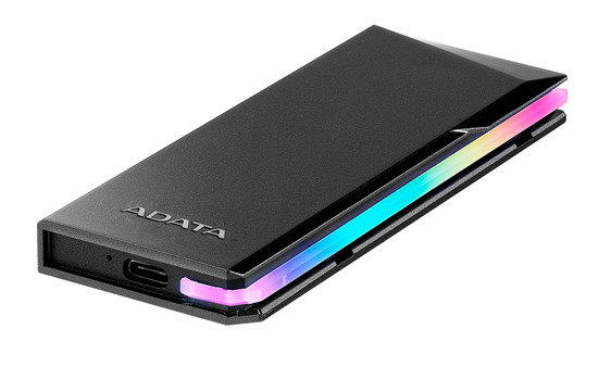 这款产品采用免工具设计,侧面覆盖条形 RGB 灯带,正面印有 Logo。硬盘盒具有一个 Type-C 接口,支持 USB 3.2 Gen2 协议,最大速率可达 1000MB/s。
