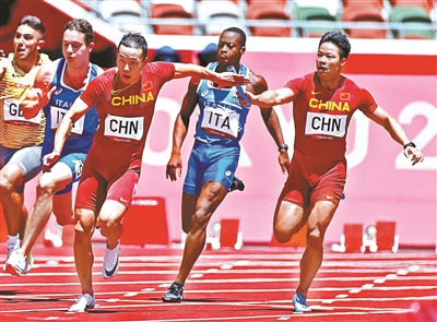 8月5日上午,在东京奥运会男子4×100米接力预赛中,由汤星强、苏炳添、谢震业、吴智强组成的中国队,以37秒92获得小组第一,顺利晋级决赛。与中国队同组的美国队只获得第六,无缘决赛。