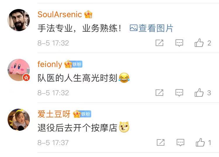 有人夸苏炳添“手法专业,业务熟练!”还有人开玩笑让他退役后开个按摩店。↓