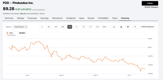 但光环也会有淡下的时候。自今年2月股价触及212.59美元高点后,拼多多在资本市场的表现开始转弱,股价下行趋势伴随着一把手的辞任变得更加明显,且延续至今。按8月4日的收盘价计算,拼多多股价年内跌幅近50%。