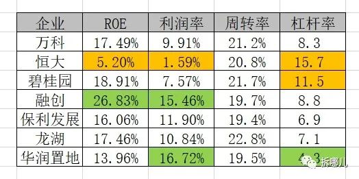 ROE(净资产收益率)的水平,是评判一家企业最为核心的指标,代表了企业经营对股东投入的回报水平。它与企业的利润率、周转率和杠杆率,息息相关。通过公式代入,我们可以简单比较分析这些头部房企的四项指标。