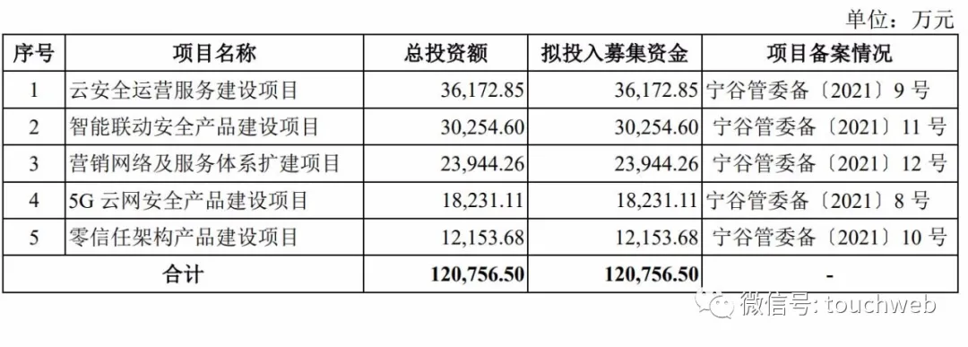 亚信安全此次计划募资12亿元,此次募资主要用于5个方面,分别为云安全运营服务建设项目、智能联动安全产品建设项目、营销网络及服务体系扩建项目、5G云网安全产品建设项目、零信任架构产品建设项目。