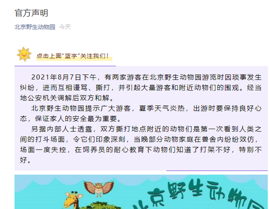 2021年8月7日下午,有两家游客在北京野生动物园游览时因琐事发生纠纷,进而互相漫骂、撕打,并引起大量游客和附近动物们的围观。经当地公安机关调解后双方和解。