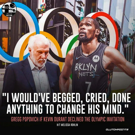 在来东京之前,当记者问波波维奇,如果杜兰特告诉他,他不愿意参加奥运会,自己会怎么做时,波波维奇打趣说道:“如果他说不,我就会哭着求他,任何我可以改变他想法的事情我都愿意做。”