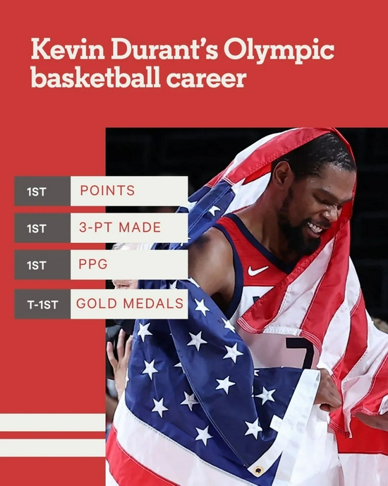可在拿了3枚奥运金牌并三次成为队内得分王的情况下,说杜兰特是美国男篮历史上最伟大的球员,丝毫不为过。