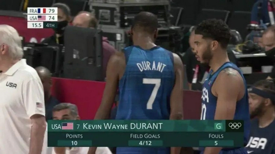 作为美国队的领袖,杜兰特全场12投4中,仅得到10分,还搭上了5次犯规。