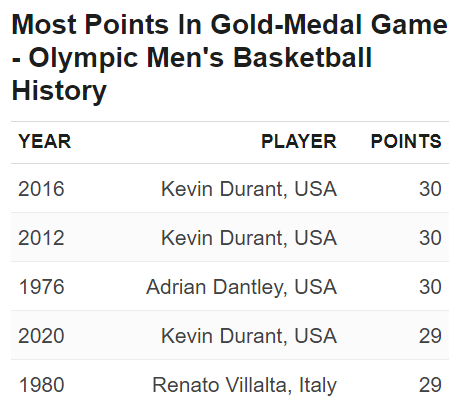 迄今为止,奥运会决赛上的5次单场最高分,有3次由杜兰特创造。