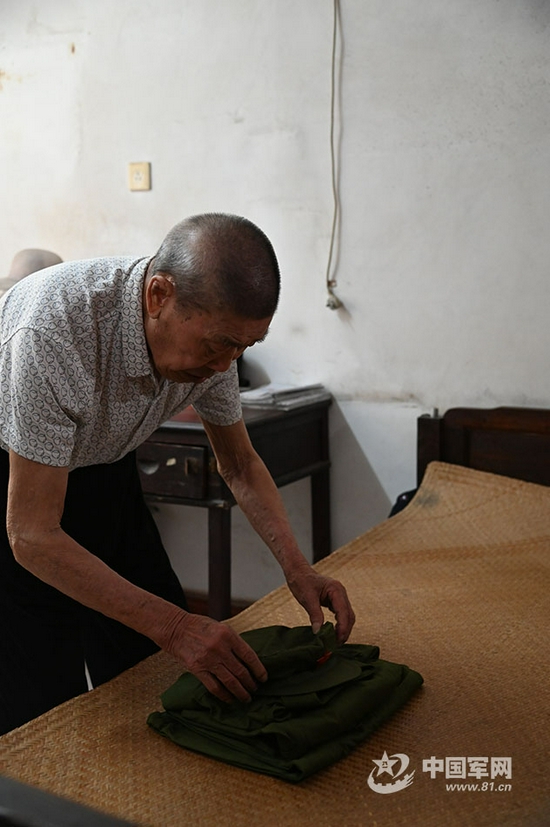 而在一个旧木箱里,一套解放军服装和帽子以及帽徽、领章更是被曾老视如珍宝。他每年都会把衣服拿出来晒一晒,50多年了,军装和军帽保存得如同新的一般。“部队培养了我,给了我一切,特别是让我晚年生活幸福无忧,我‘百年’之后,要穿着这身军装离开。”