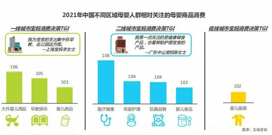 数据显示,一线城市宝妈比较关注大件婴儿用品和早教娱乐;二线城市的宝妈则更加关注医疗健康、玩具和食品的消费决策;低线城市的宝妈对婴儿服饰的穿搭兴趣度更高。