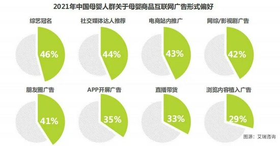 小巴在报告中发现,综艺冠名和社交媒体达人推荐是受母婴人群欢迎的互联网广告形式。反倒是热门的直播带货只有33%的母婴人群接受。