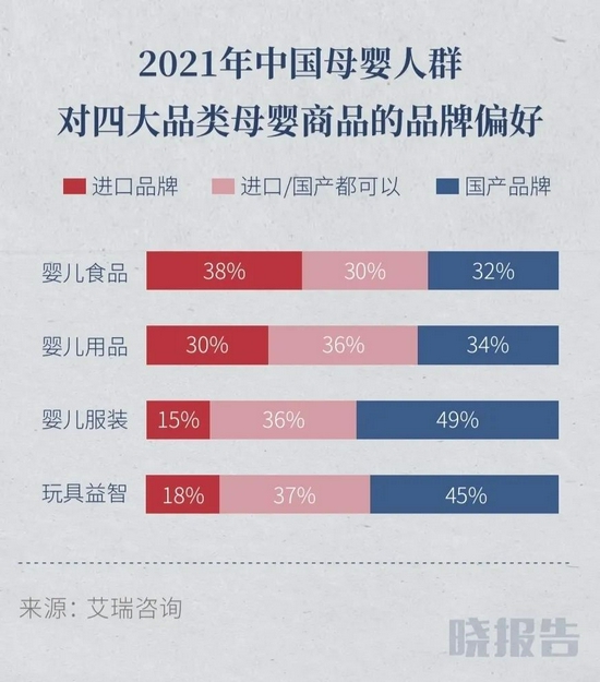 随着国潮风的兴起,国产婴儿用品、服装和玩具变得更受欢迎,像国产婴儿服装产品的接受度在49%。但是在婴儿食品方面,还是进口品牌更受欢迎些。