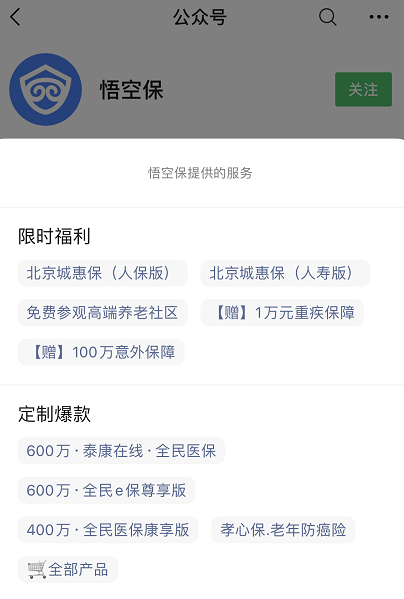 据《中国消费者报》了解,悟空保是安润国际保险经纪(北京)有限公司推出的一款互联网保险业务,其系列有“悟空全民医保康享版”“全民医保2021版”“孝心保、老年防癌险”等多款产品。