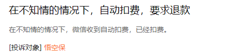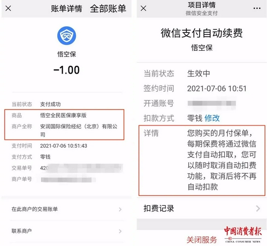 “订单显示,在支付1元的同时,悟空保便绑定了微信支付自动续费,且时间为长期有效,但这些我全然不知,可能是刷视频时误点了什么链接或者参与了什么抽奖。”