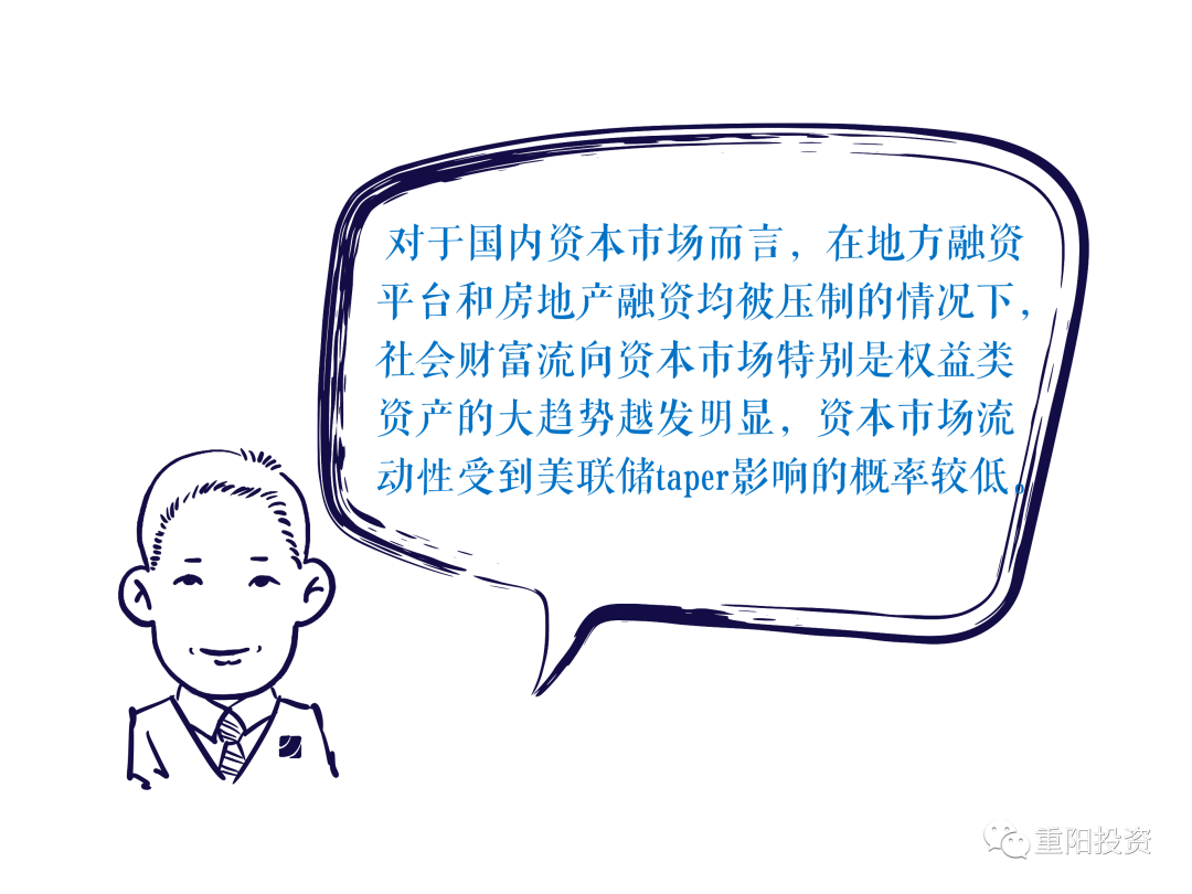 国内流动性,特别是资本市场流动性有望保持平稳。在本轮宏观政策周期上,中国是领先于美国的。中国自去年5月就开始了货币政策正常化,至今年上半年货币政策已经回归疫情前常态。在最新公布的二季度货币政策执行报告中,央行专门提到“增强宏观政策自主性”。这意味着中国的货币政策将根据自身的经济形势和物价走势决定,不会盲目跟随美国的货币政策。对于国内资本市场而言,在地方融资平台和房地产融资均被压制的情况下,社会财富流向资本市场特别是权益类资产的大趋势越发明显,资本市场流动性受到美联储taper影响的概率较低。