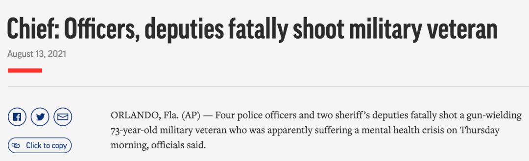 据美国“坦帕湾时报”报道,当地时间周四早上,四名警察和两名副警长在奥兰多射杀了一名持枪的73岁退伍军人。这名老人看上去出现了精神问题。