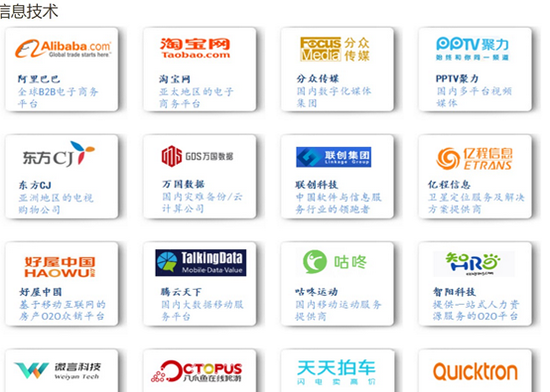 具体来看,信息技术类企业27家,包含阿里巴巴、淘宝网、分众传媒、PPTV聚力、东方CJ、万国数据、联创科技、亿程信息、好屋中国、腾云天下、咕咚运动、智阳科技、微言科技、八爪鱼、天天拍车、快仓科技、理才网、码隆科技、衣二三、趣活、影谱科技、Bus365 、中东头条、三维家、中城智慧、漏网银行和特赞。