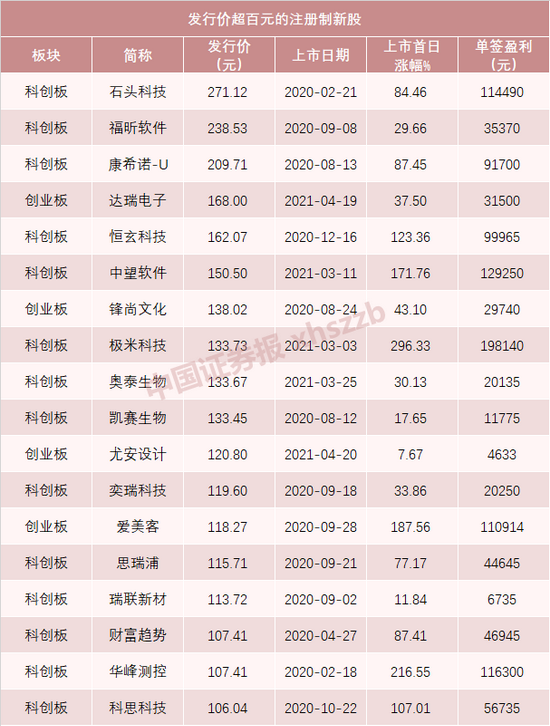 在已经上市的注册制新股中,发行价超过百元的新股共有18只,上市首日收盘平均涨幅为91.69%,平均单签盈利6.5万元。其中,打新收益最高的新股是极米科技,单签盈利为19.81万元。