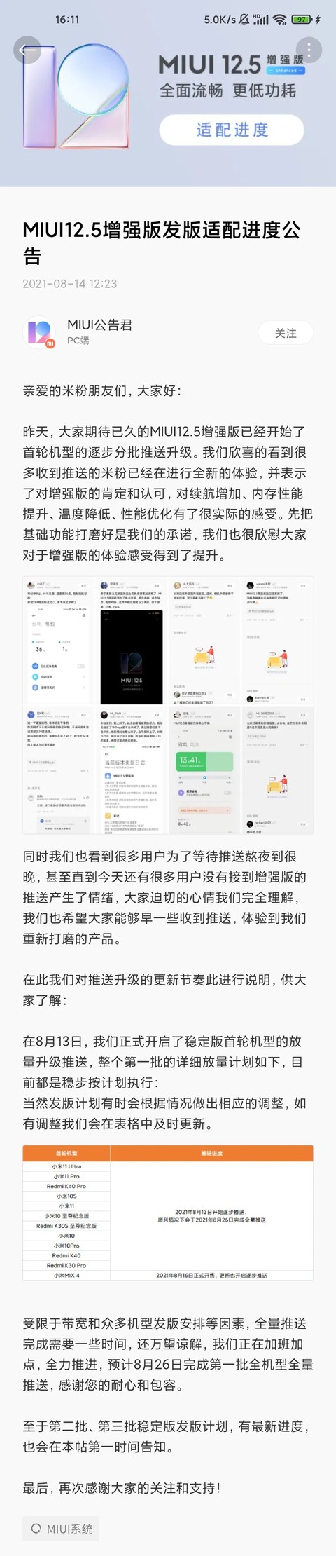 目前,MIUI 12.5 增强版已开启首轮机型的逐步分批推送升级。今日,小米官方发布了 MIUI 12.5 增强版发版适配公告。