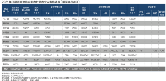 分种类看庄稼受灾情况,小麦已收割,不受此次水灾影响,花生、大豆、玉米折损较大。浚县农业农村局8月3日的农业灾害统计表显示,玉米成灾面积54.8万亩,超过花生9.1万亩及大豆5416.5亩。根据耕种时间表,水灾发生时夏粮(小麦)已经收割完毕,被淹的主要是玉米、花生、大豆等秋粮作物。而农业农村部数据显示,截至7月29日,河南省农作物受灾1450万亩,成灾940万亩、绝收550万亩。