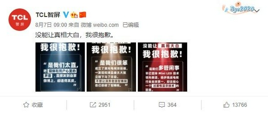 近日,国内两大主流电视品牌TCL和海信之间的商业诋毁纠纷终审落锤,而就在终审判定后不久,TCL疑似对其作出回应,在官方微博上发布了一条“没想让真相大白,我很抱歉”的博文,并配发了三张图片,由此该事件再一次引起业界的关注。