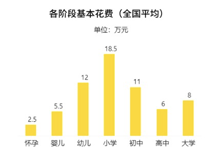 到了婴儿阶段,这个成本就增长到了15.8万元,幼儿阶段则是10-20万元,小学阶段大概是9到20万元,中学阶段8-45万元,大学阶段或是考研留学还有一笔巨额费用。据此汇总,总成本大约是75.8万元到199.1万元之间,但是这还不算通货膨胀和学区房等其他开支。