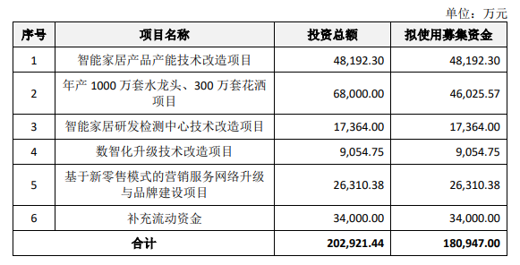 本次IPO,箭牌家居拟公开发行不超过9,899.6717 万股人民币普通股,募集180,947万元,用于多个项目的改造升级、品牌建设及补充流动资金等,其中用于品牌建设、补充流动资金的金额分别为26,310.38万元、34,000万元,合计60,310万元,占本次募集资金总额的比例为33.33%。