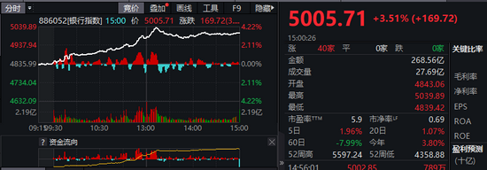 银行股亦有所发挥,龙头与次新双双大涨,瑞丰银行涨停,招商银行大涨7%,长沙银行、平安银行、齐鲁银行和宁波银行皆大涨,银行指数大涨超3.5%。