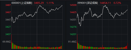 周三,市场在犹豫中迎来报复性反弹。截至收盘,上证指数上涨1.11%,报3485.29点,深证成指涨0.72%,创业板指涨0.75%,报3248.37点,科创50跌0.08%。从资金面来看,全天成交近1.2万亿元,较前一交易日量能有所收窄。北向资金全天净买入34.33亿元,为连续3日净买入。