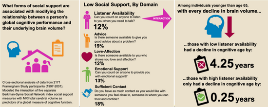 这项研究的数据来自著名的弗雷明翰心脏研究(Framingham Heart Study,FHS)的收集,FHS历经70多年,是美国追踪时间最长、监测最密切的队列研究之一。研究人员分析了参与者的脑容量变化、神经心理学评估结果,以及他们每个人报告的人际互动信息,例如获得的倾听、建议、爱和亲情、情感支持等。