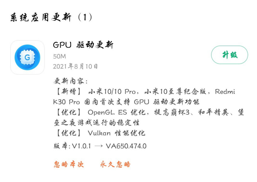 本次更新的版本号为 VA650.474.0,对 OpenGL ES、Vulkan 优化,提高《崩坏 3》、《和平精英》、《堡垒之夜》游戏运行的稳定性。