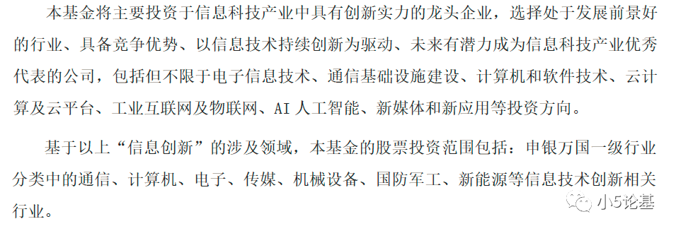 这只基金同样是一只科技行业主题基金,从其“信息创新”的定位就基本可以知道这只科技主题基金的定位主要是包括通信、计算机、电子、传媒等信息技术创新相关的行业。