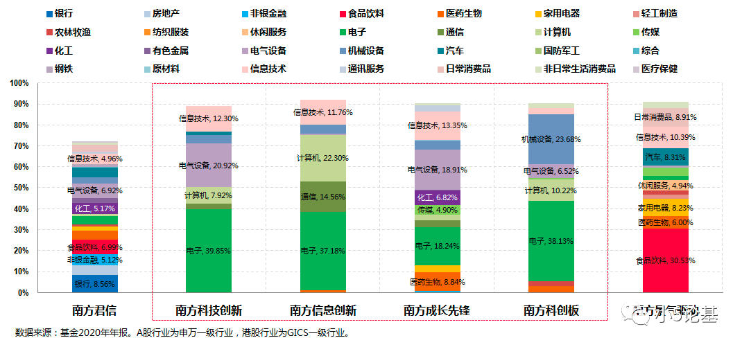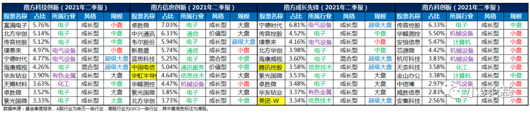 从图中可以大致看出,南方科技创新主要偏重新能源和以半导体为主的电子板块,南方信息创新则聚焦于TMT板块,南方科创板集中于科创板的投资,而南方成长先锋则相对更为均衡,几乎涉及上述“科技创新”提到的各大高科技板块。