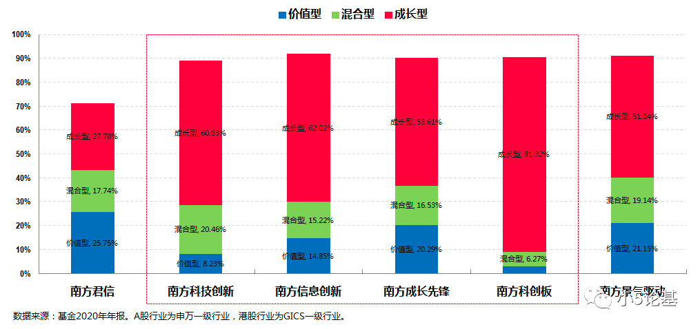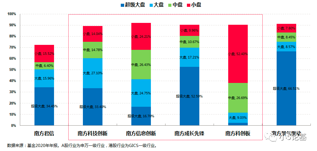 其中,南方成长先锋和南方科技创新相对来说比较偏大盘,而南方科创板则明显偏中小盘,南方信息创新则大小盘较为均衡。