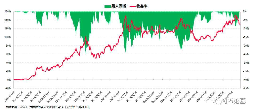 从收益率的角度来看,这只基金在茅炜管理期间(2019年6月19日至2021年8月13日),总收益率为131.00%。从回撤控制的角度来看,这只基金在茅炜管理期间的最大回撤为-25.65%,这个最大回撤同样发生于2020年一季度。