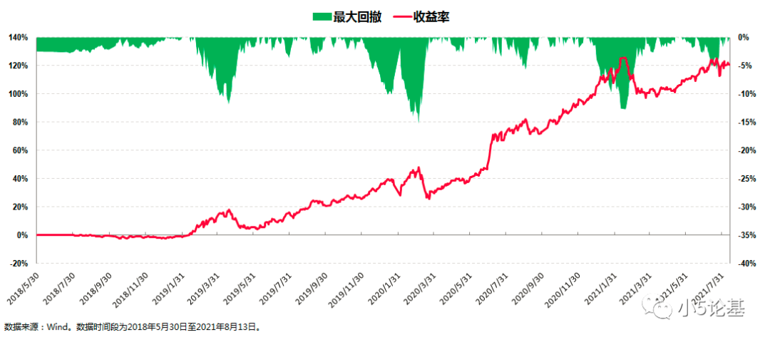 从收益率的角度来看,这只基金在茅炜管理期间(2018年5月30日至2021年8月13日),总收益率为120.79%。从回撤控制的角度来看,这只基金在茅炜管理期间的最大回撤为-15.26%,这个最大回撤同样发生于2020年一季度。