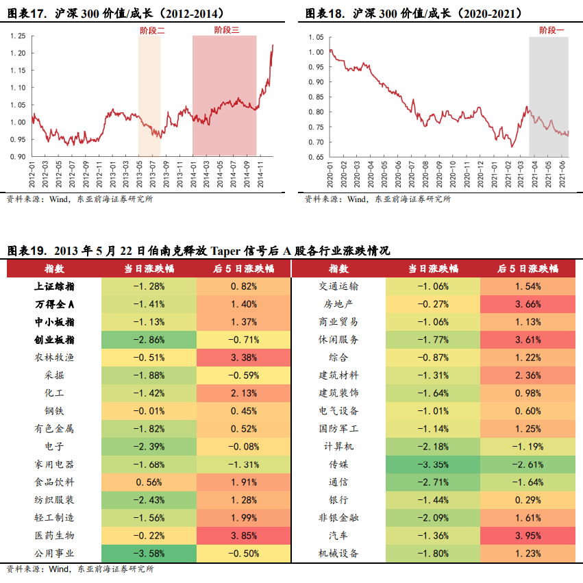 阶段二(宣布Taper):结构上价值股占优。2013年伯南克宣布Taper后美债收益率快速攀升,美股期初快速下跌,随后重拾涨势。受当时欧元区缩表导致的欧美货币政策错位以及全球经济缓慢复苏影响,美元指数快速走弱。中美利差下行后V型反转,情绪短暂冲击后市场迅速重回正轨。人民币升值影响下价值股表现相对较好,而估值的调整对成长股价格形成更大压制。
