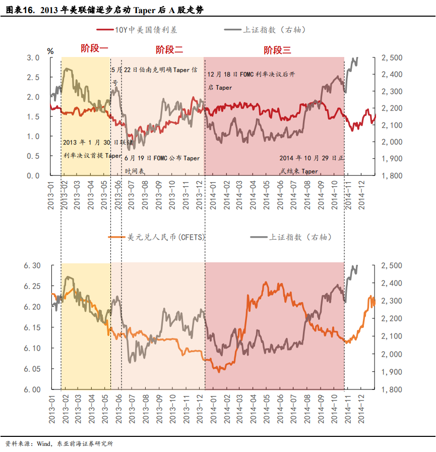 阶段一(讨论Taper):总体风险大于机会。参考2013年美联储首提Taper后,中美利差区间震荡,人民币升值,而上证指数快速下行,直至5月Taper预期发酵阶段出现了阶段性反弹。