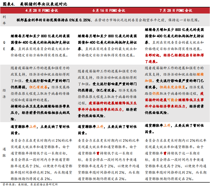 第二,6-7月美联储议息会议显示联储态度已经开始边际转鹰。6月16日美联储上调了经济与通胀预期(今年GDP预计增长7%,高于之前预测的6.5%;PCE通胀率为3.4%,较今年3月上修1个百分点)。7月29日FOMC议息会议整体基调偏鸽,但可以看出美联储已经开始在为Taper做准备。美联储已经开始讨论缩减资产购买,7月FOMC会议声明“经济已经取得进展”并对就业恢复持有积极态度,且可以看出Delta病毒的发酵并未扭转美联储对经济复苏的乐观预期。我们在《美联储Taper如何影响市场?》