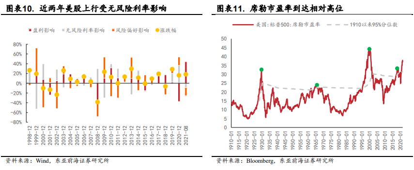 对于美股而言,我们认为此次Taper对市场的影响将大于2013年。一方面,极度宽松的货币政策是推动去年3月底以来美股快速上行的主要因素,结合过去13轮美股牛熊转换历史来看货币政策的超预期收紧一般是刺破泡沫的核心因素之一。另一方面,从政策、资金、市场特征、投资者情绪及估值多个维度看,我们认为美股市场基本具备了顶部区域的特征。货币政策边际趋紧或将对美股估值造成较大压力,当前美股市盈率已经再次突破95%的历史分位数,第三次超过了大萧条前32.56的历史次峰,高达37.86倍。